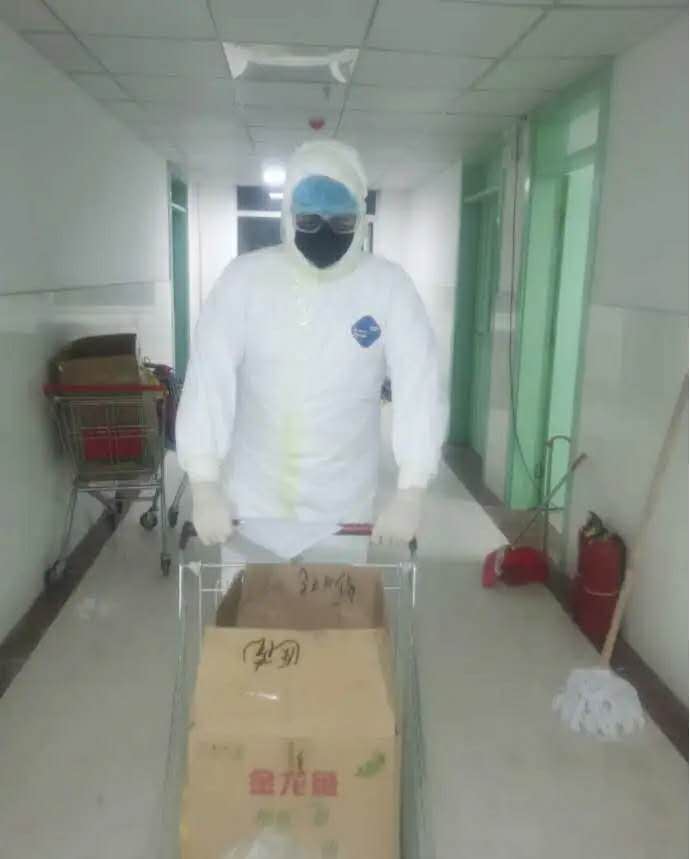 平日里,矿前社区卫生服务站管理着800多名高血压病人和270多名糖尿病人,疫情突然,大家备的药也不多,可是这药又不能断,所以每天都有大量的居民给社区卫生服务站打电话要求送药。辖区内有一位83岁的老奶奶崔秀荣,因为小区封闭,年轻人都会在手机上微信群里买菜,可是她的子女平时都不在一起生活,这下可急坏了老人家。老奶奶的小女儿通过电话向社区卫生服务站求助,因为社区服务人员不足,且全是女同志,站里就把这位老奶奶每天送菜、送生活用品的任务交给了庞文硕。一个多月来,为了服务好这些居民,在做好消毒的同时,他每天还要抽时间为隔离小区的居民送药,帮着采购日常生活用品。随着疫情的发展,医务人员严重短缺,作为一名医学生,庞文硕同学自愿来到当地的隔离点参加志愿行动。隔离点在六矿医院,离他有5公里远。新华区的疑似患者与密切接触者都要在这里进行医学隔离观察。隔离点条件艰苦,每天只能吃方便面,喝白开水。隔离中心值班每班两个人,四个小时一换班。因为隔离衣很珍贵,为防止大小便只能提前半天就不吃不喝。无论是深夜还是凌晨,他都是提前到达,穿上防护服、戴上口罩与护目镜之后就和其他志愿者们开始了紧张的工作:一天4次为100多名隔离观察人员测量体温、送饭、消毒,为他们送生活用品……在这个隔离观察点,就先后有两名隔离期间被确诊的患者。