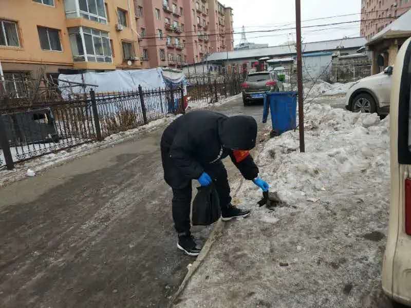 还有就是进入到小区里面捡人们废弃乱扔的口罩,社区为他们准备了夹子以及手套、口罩,二月份的东北气温挺飘忽不定的,夜晚温差比较大,有的口罩白天扔在水里,第二天早上就冻在了冰里,志愿者们需要破冰,然后将口罩取出来,也是很麻烦的。最后收集的口罩都会被统一处理。