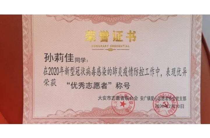 志愿期间,她最大的困难是住宿问题,由于家离市里有些远,她的父亲有时间的情况下会接送她,没有时间的情况下,她就在舅舅的店里打地铺。也正因为她的勤勤恳恳,所以荣获了当地政府颁发的优秀志愿者证书,是荣誉也是肯定,使她更加坚定地投入到防疫工作中去。