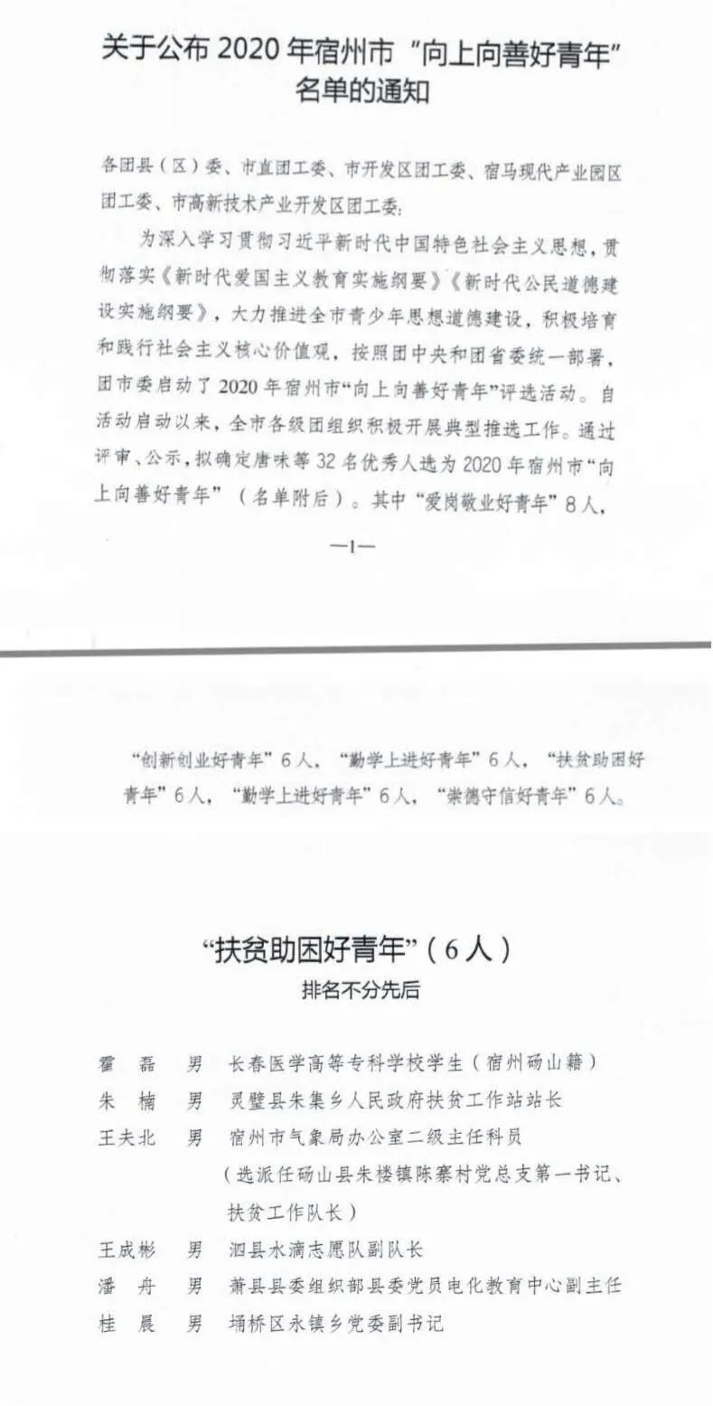 我校2017级临床二班霍磊同学,在新冠肺炎疫情爆发期间,再一次彰显了他的好人精神,在共青团宿州市委评选的“向上向善好青年”当中,再次榜上有名。