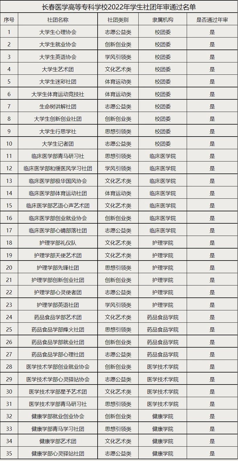 为深入学习贯彻习近平总书记关于高校思想政治工作和青年工作的重要论述,切实加强我校学生社团建设管理,积极推进学生社团健康有序发展,充分发挥学生社团育人功能,按照《长春医学高等专科学校社团管理实施细则》的要求,至2022年11月28日,共收到学生社团年审材料35份。经校团委对社团基础材料、年度活动开展情况、社团所获荣誉等相关审核,最终有35个学生社团通过年审予以注册,1个社团予以注销,具体结果公示如下(排序不分先后):