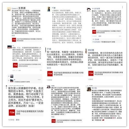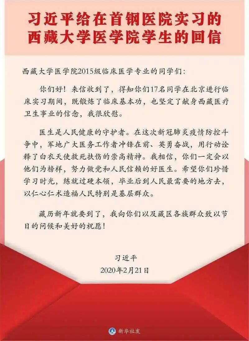 习近平总书记在回信中说道:“在这次新冠肺炎疫情防控斗争中,军地广大医务工作者冲锋在前、英勇奋战,用行动诠释了白衣天使救死扶伤的崇高精神。我相信,你们一定会以他们为榜样,努力做党和人民信赖的好医生。”在首钢医院实习的西藏大学医学院学生坚参平措激动地说:“我会努力做党和人民信赖的好医生!”