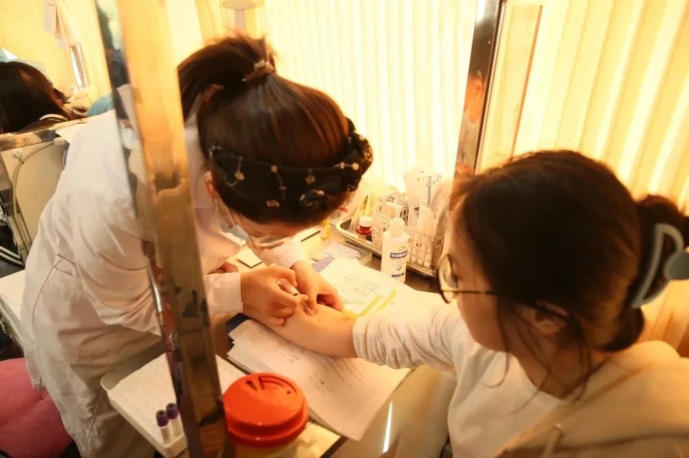 活动现场,在血站医务人员和学校青年志愿者的协调组织下,广大医专学子有序地进行填表、信息录入、体格查询、初筛化验、静脉采血等流程。同学们争先参与,热情高涨,臂弯中流出的殷殷热血,汇聚成了护佑生命的大爱暖流。同时,医务人员和志愿者们为每位献血同学都送上几句采血后注意事项的嘱咐,也让爱心温暖着每位奉献者。