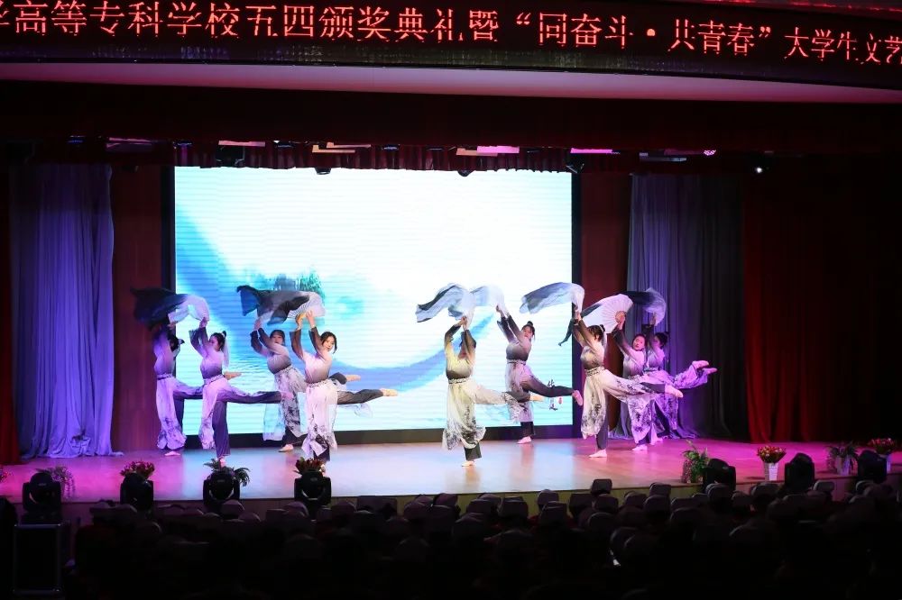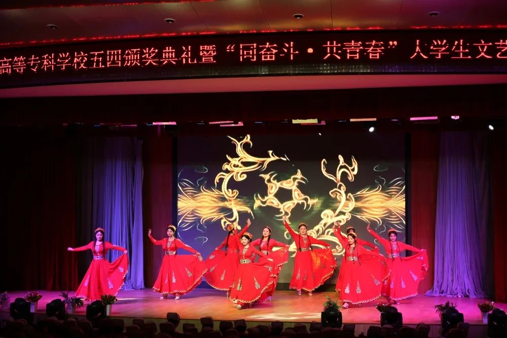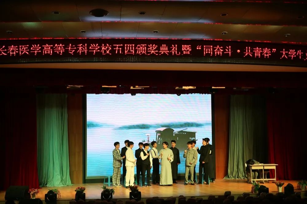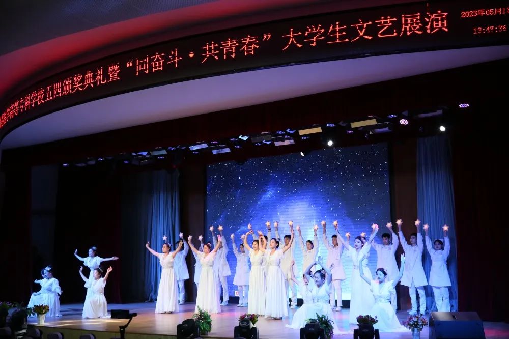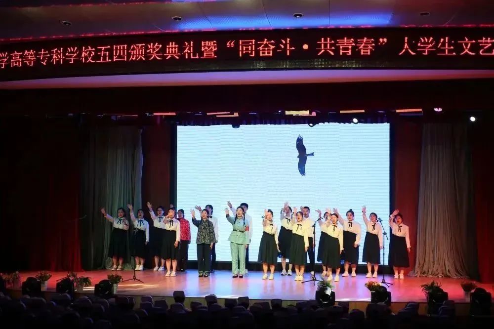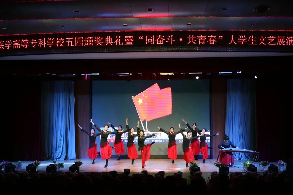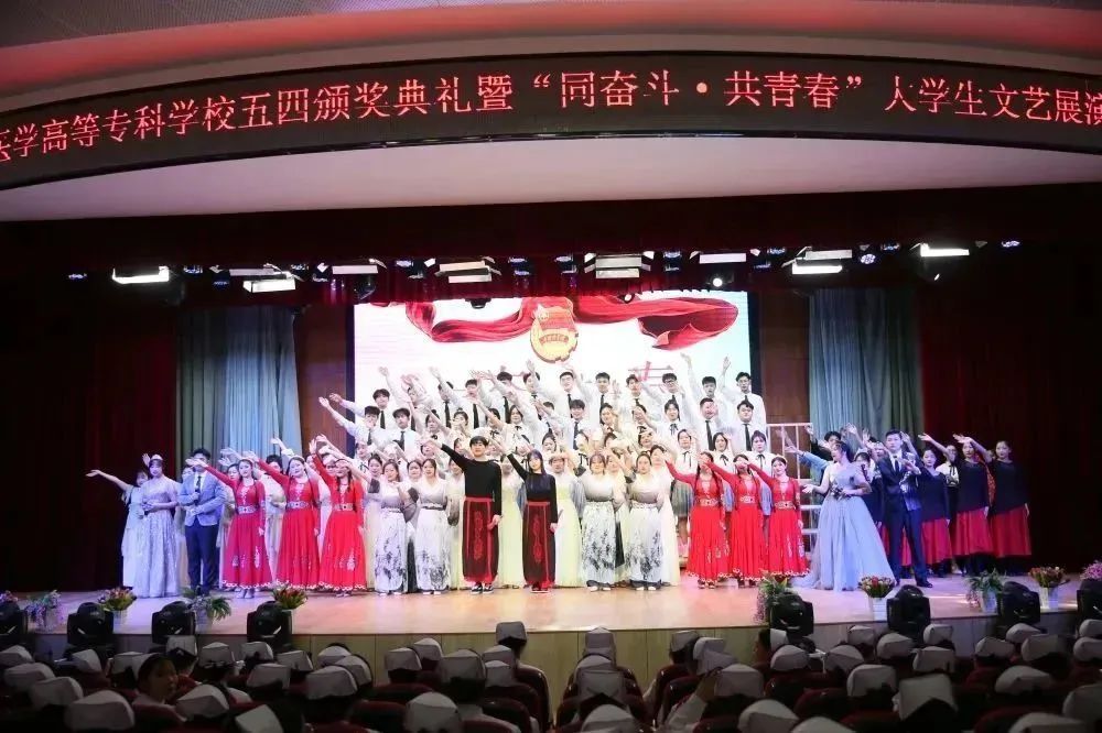 颁奖典礼结束后,一支青春洋溢的当代舞《医护青春》拉开了文艺展演的序幕。激昂振奋的音诗画表演《青春中国》和情景小合唱《青春》,展现了一代代共和国功勋青年时的意气风发,激励着每一位新时代的建设者和接班人为实现中华民族伟大复兴接续奋斗;原汁原味的维吾尔族舞蹈《石榴红了》、含情脉脉的当代舞《如愿》和唯美优雅的民族舞《采茶》,通过不同的表现形式、不同的风格韵味,演绎了在中国共产党领导下国家繁荣富强、人民安居乐业的幸福生活;校园剧《与信仰对话—梦回红船》讲述了中国青年与历史、与信仰对话的故事,歌颂了为中华民族振臂高呼、舍生忘死的青年志士;舞蹈串烧《山河华夏》掀起了展演的高潮,将深受青年学生喜爱的动感爵士舞与柔美的中国古典舞相结合,一刚一柔的完美融合点燃全场气氛;演出在大合唱《明天会更好》中落下帷幕,歌声鼓舞着医专学子踔厉奋发书写青春篇章,让青春助力高质量发展,在奋斗的新征程中走在前列。
