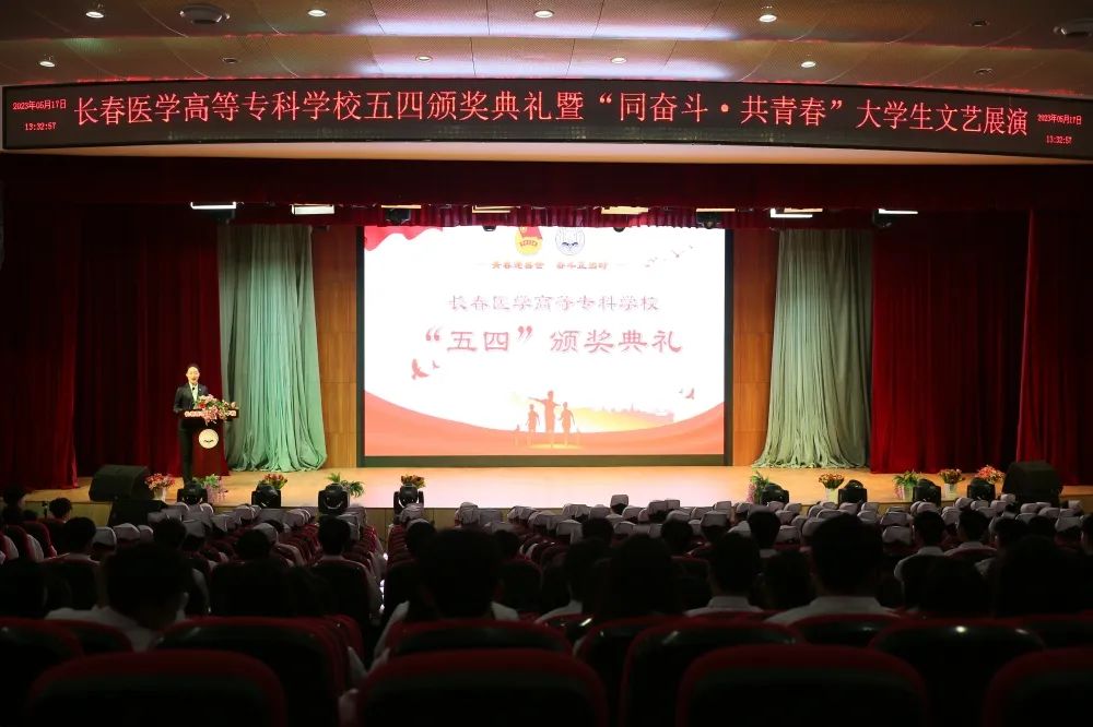 五月繁花似锦,青春激情飞扬。为弘扬五四精神,激励广大医专学子挺膺担当、砥砺奋斗,表彰过去一年为共青团事业发展做出贡献的集体和个人,5月17日13:30分,学校五四颁奖典礼暨“同奋斗 共青春”大学生文艺展演在图书馆报告厅隆重举行。长春市卫生健康委员会机关党委专职副书记孟莉、长春市教育局团委书记刘牧,学校党委书记杜影、校长袁兆新、副校长张凯、党委副书记高洪宇出席活动。校院两级学团工作人员及500余名学生代表参加活动,活动由团委书记刘思雅主持。