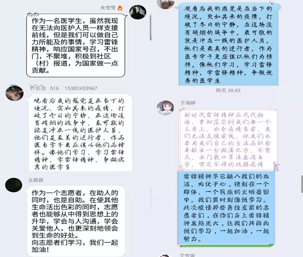 春风已悄然吹拂的三月,“学习雷锋好榜样,忠于革命忠于党……”的歌声,开始在我们的脑海中浮现。今年因为新型冠状病毒的疫情防控,我们响应号召,在家为防疫志愿者点赞!不“疫”样的雷锋日,在防“疫”一线闪光。2020年3月5日,是全国第57个学雷锋日。在抗击疫情期间,总有一些人把雷锋精神贯穿到疫情防控一线,像雷锋同志那样做人做事,用实际行动把“学雷锋”诠释的淋漓尽致,为打赢这场疫情防控阻击战贡献力量……武汉加油!中国加油!81岁老党员马秀枝同志不顾自己年事已高,踊跃参加志愿值守工作;黄忠义同志的心脏不好,早年间做过心脏支架手术,黄宗彦老人患有肝囊肿,平时不能太过劳累,他们年近七十仍主动报名参加志愿值守。三位老党员不仅用实际行动践行了党员的初心和使命,更为广大青年党员树立了榜样。疫情志愿者并不是远在天边,而是近在眼前,特殊表扬班里魏佳雯同学,疫情期间无私奉献,我们应当向她学习,做好祖国的接班人,因为疫情我们在微信群里召开本次主题班会,使同学们明白国家兴亡匹夫有责,作为一名新时代的大学生,我认为自己应该义不容辞的加入这场疫情防控战,千千万万的志愿者和我们有着一样美好的期待,期待着春暖花开。他们对生活充满热情,他们也害怕过,却依旧挺身而出,致敬最美的逆行者,我们一起为他们加油。