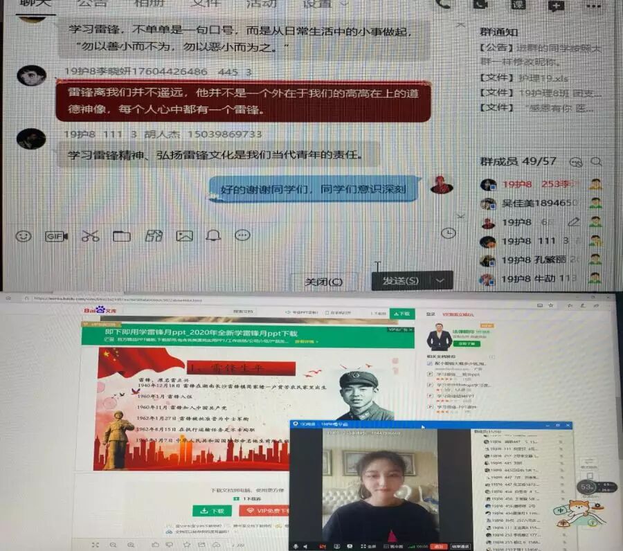 三月是“学雷锋”主题活动月,在此疫情期间,我支部组织网上在线班会主题教育,由团支书王泽宇介绍了雷峰同志的事迹,家庭背景,呼吁同学们要学习雷锋同志的钉子精神,在实践中不断丰富和发扬这种革命精神。