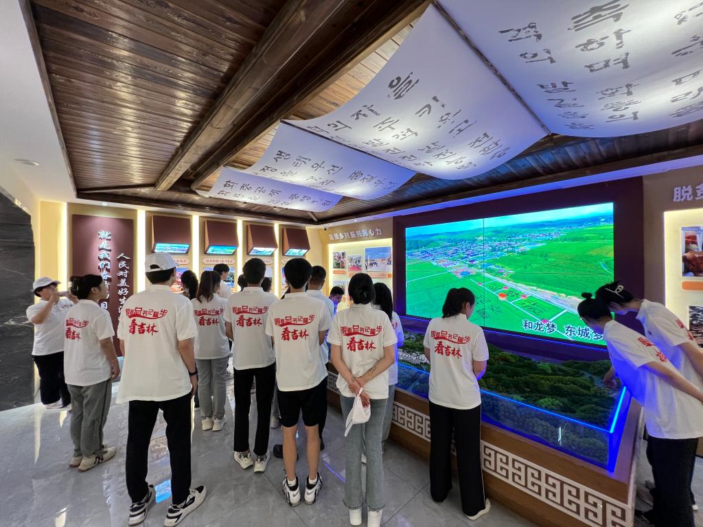 延边行的第三站来到的是2015年总书记曾经视察过的村落——和龙市东城镇光东村。成员们走进村史展览馆,大家仔细聆听了讲解员的介绍,观看了丰富翔实的图片与视频。整个展馆将光东村今昔对比、亮眼的脱贫攻坚和乡村振兴等成绩单一一展现,高度浓缩了光东村在基层党组织建设、脱贫攻坚、乡村振兴、民族团结、人居环境、产业发展等方面取得的成就和先进做法。成片的绿色稻田,特色的朝鲜族庭院,总是在不经意间和蓝天白云同时“入画”,每一个画面都是一份最有说服力的“旅游攻略”。成员们在感受吉林大地翻天覆地、日新月异的变化中,更加清晰地认识到了新时代大学生肩上的使命与担当,坚定了建设美丽家乡的信念。大家纷纷表示在以后的学习中一定会把自己的个人梦想同家乡梦想、国家梦想、民族梦想结合起来,为实现家乡发展建设贡献一份力量。