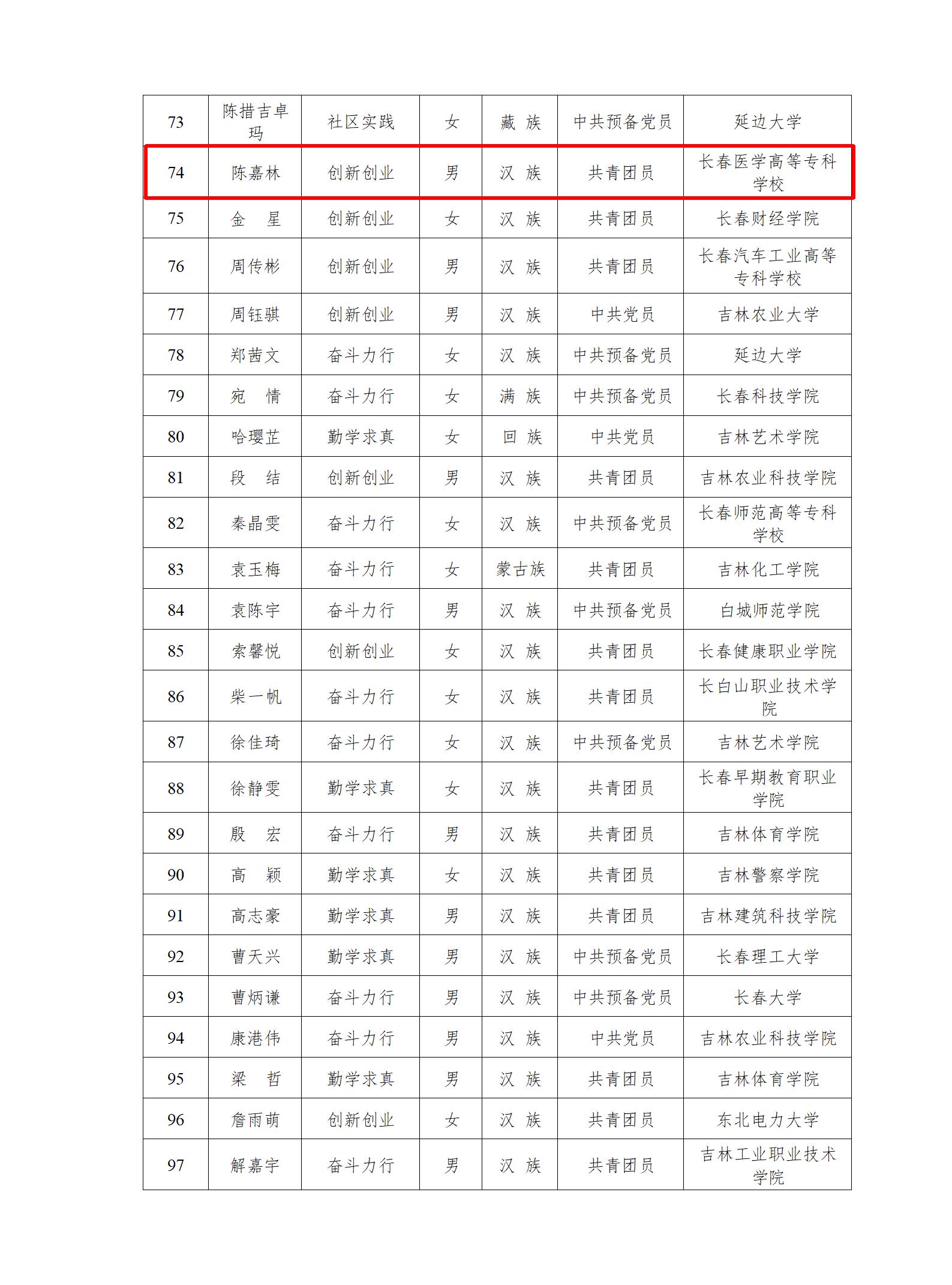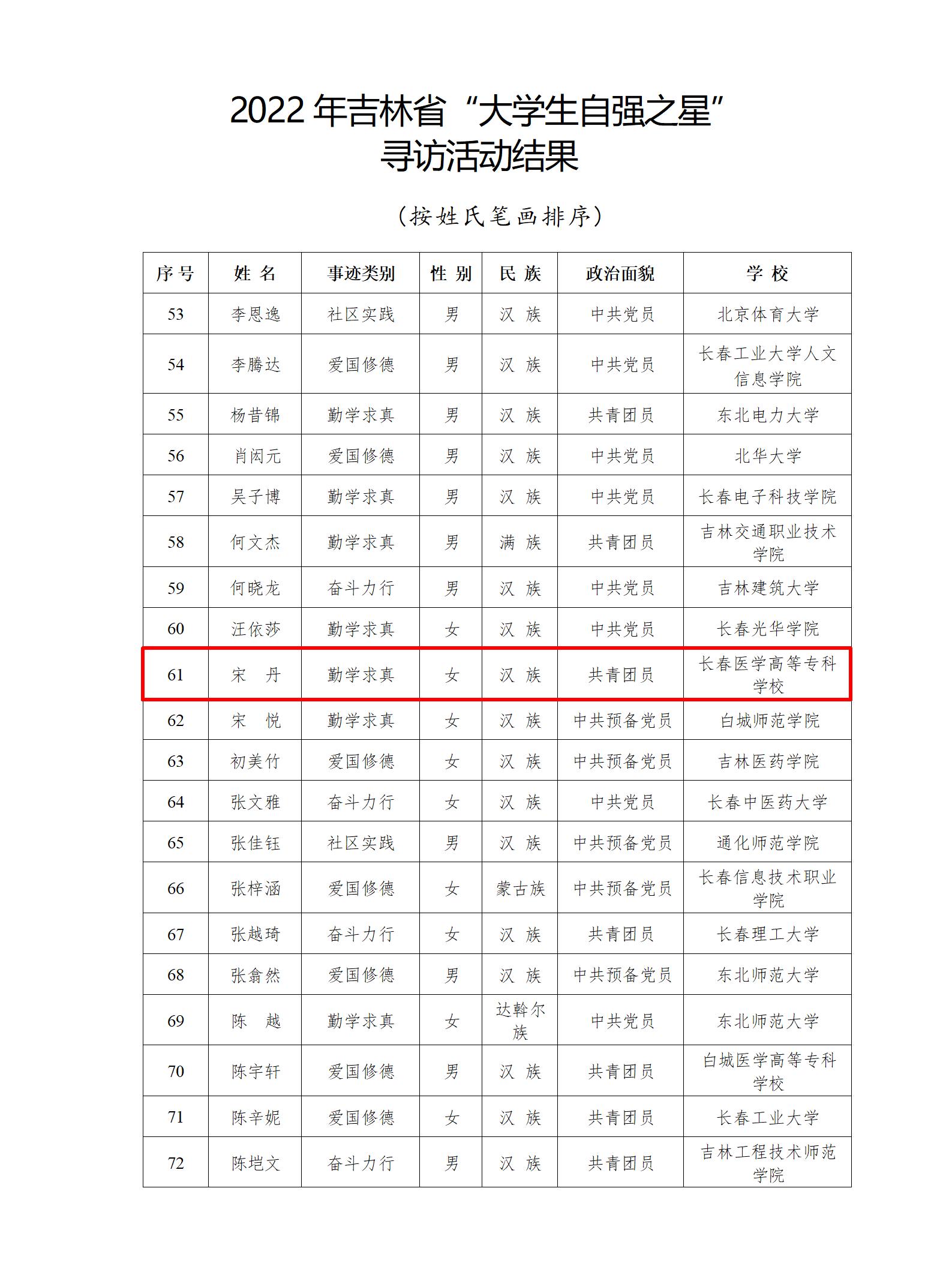 2023年4月,共青团吉林省委、吉林省学生联合会联合开展2022年度吉林省“大学生自强之星”寻访活动。经过层层遴选,我校推荐的5名候选人中:健康学院2020级中医二班陈嘉林同学,获得创新创业类“大学生自强之星”荣誉称号;医学技术学院2021级影像班宋丹同学,获得勤学求真类“大学生自强之星”荣誉称号。
