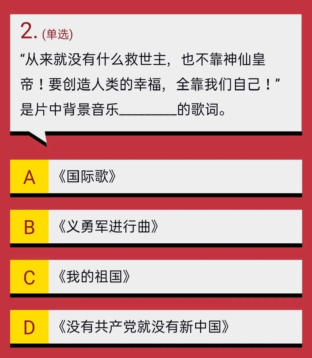 “从来就没有什么救世主,也不靠神仙皇帝!要创造人类的幸福,全靠我们自己!我们要夺回劳动果实,让思想冲破牢笼!快把那炉火烧得通红,趁热打铁才能成功!”《国际歌》(L'Internationale)是由欧仁·鲍狄埃在1871年作词,皮埃尔·狄盖特于1888年谱曲而成的歌曲。
