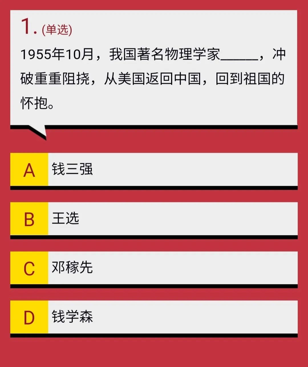 1955年,经过周恩来总理在美国外交谈判上的不断努力——甚至不惜释放11名在朝鲜战争中俘获的美军飞行员作为交换,1955年8月4日,钱学森收到了美国移民局允许他回国的消息。1955年10月8日,钱学森一家终于回到了自己魂牵梦绕的祖国。因此本题答案选:D