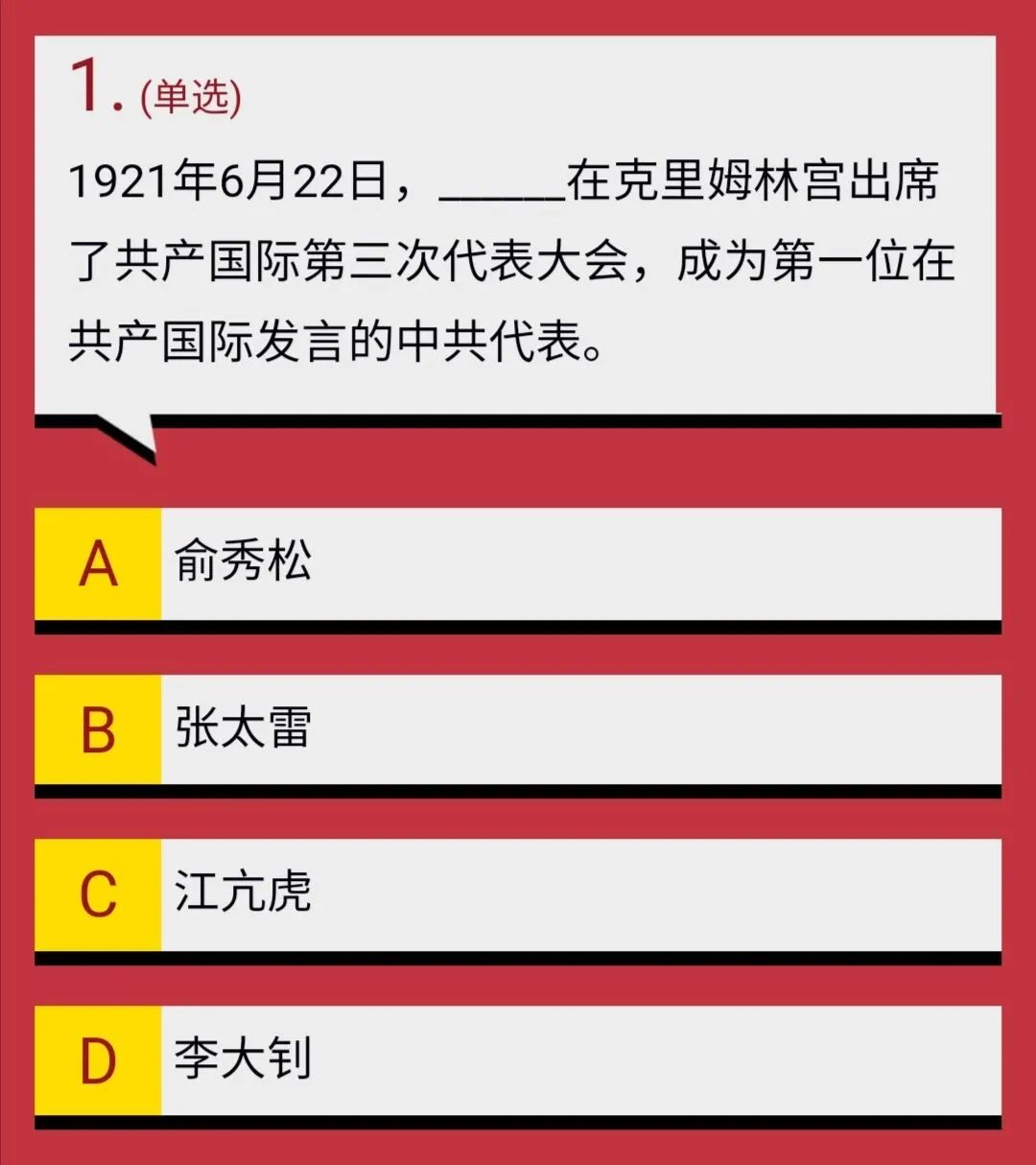 1921年6月22日,克里姆林宫安德烈大厅内掌声雷动,国际歌响彻全场,张太雷出席了共产国际第三次代表大会。他向大会提交了报告,阐明了中国国内工人运动的现状,并发表了振奋人心的演讲呼吁共产国际,对中国革命提供更多支持和帮助,张太雷也因此成为第一位在共产国际发言的中共代表。